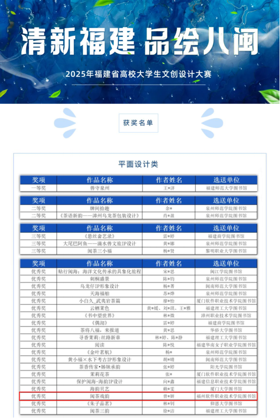 近日,“清新福建·品绘八闽——2025年福建省高校大学生文创设计大赛”获奖名单正式揭晓。本届大赛以展现福建独特魅力与文化底蕴为核心,吸引了全省众多高校学子参与,经严格评审,我院数字媒体艺术设计专业2024级3班曾诗妍同学(指导老师:杨莉)荣获优秀奖。