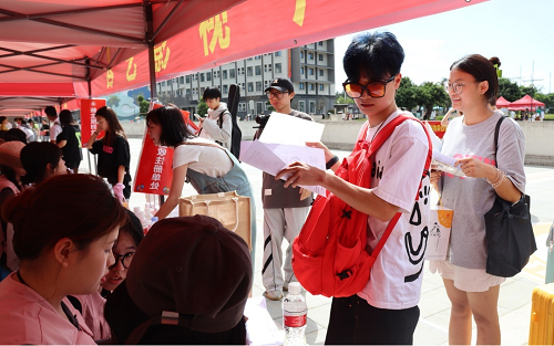 穿上志愿服,摆好迎新的摊位点。碧空如洗,万里无云,在这个美好的日子里,老师和志愿者们一早到达了报到处,有序开启一天的工作。